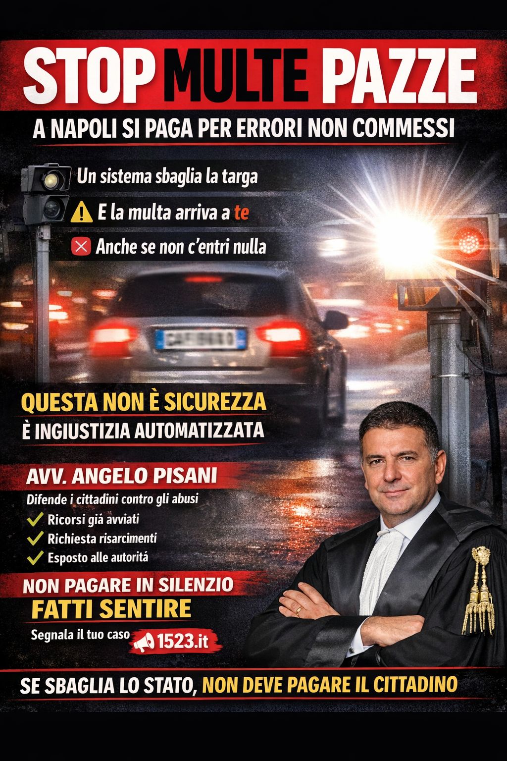 «Non siamo di fronte a un semplice disguido – dichiara l’Avv. Angelo Pisani – ma a un sistema che, se non controllato e soprattutto realmente omologato, produce ingiustizie e danni seriali. È inaccettabile che un cittadino debba difendersi , pagando e perdendo tempo e serenità, da multe per infrazioni mai commesse, affrontando tempo, costi e stress per colpe non sue».