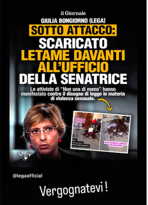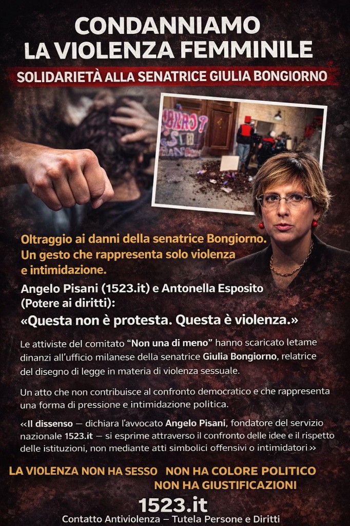 Le attiviste del comitato femminista “Non una di meno” hanno scaricato letame dinanzi all’ufficio milanese della senatrice Giulia Bongiorno, relatrice del disegno di legge sulla violenza sessuale. «Mi pare evidente – tuona l’avvocato Angelo Pisani, fondatore del servizio antiviolenza nazionale 1523.it - che le agitatissime attiviste non abbiamo letto o compreso il testo in discussione, un testo che sostanzialmente risponde alle indicazioni emerse nel corso della discussione parlamentare di porre al centro la donna e la sua autodeterminazione. Nell’articolo 609-bis del Codice Penale, cui si appigliano le attiviste – aggiunge Pisani – l’autodeterminazione della donna era del tutto assente». «Si tratta dunque – dichiara ancora l’avvocato Pisani – di una forma di violenza del tutto gratuita, che risponde solo alle logiche di una lotta politica basata sulla violenza e non sui contenuti, spiace che ancora una volta le femministe, che pure tante volte hanno sostenuto giusti principi di libertà, questa volta si abbandonino ad atti incivili per il solo antagonismo politico, senza conoscere a fondo i motivi del loro gesto».