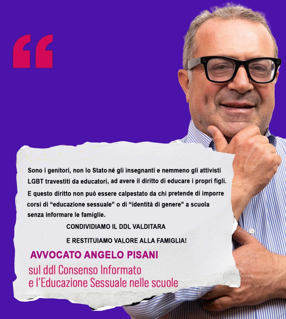 «Sono i genitori, non lo Stato, non gli insegnanti e nemmeno gli attivisti LGBT travestiti da educatori – dichiara Pisani, candidato alla Regione con la lista Edmondo Cirielli Presidente – ad avere il dovere e il diritto di educare i propri figli. E questo diritto non può essere calpestato da chi pretende di imporre corsi di “educazione sessuale” o “identità di genere” a scuola senza informare le famiglie».